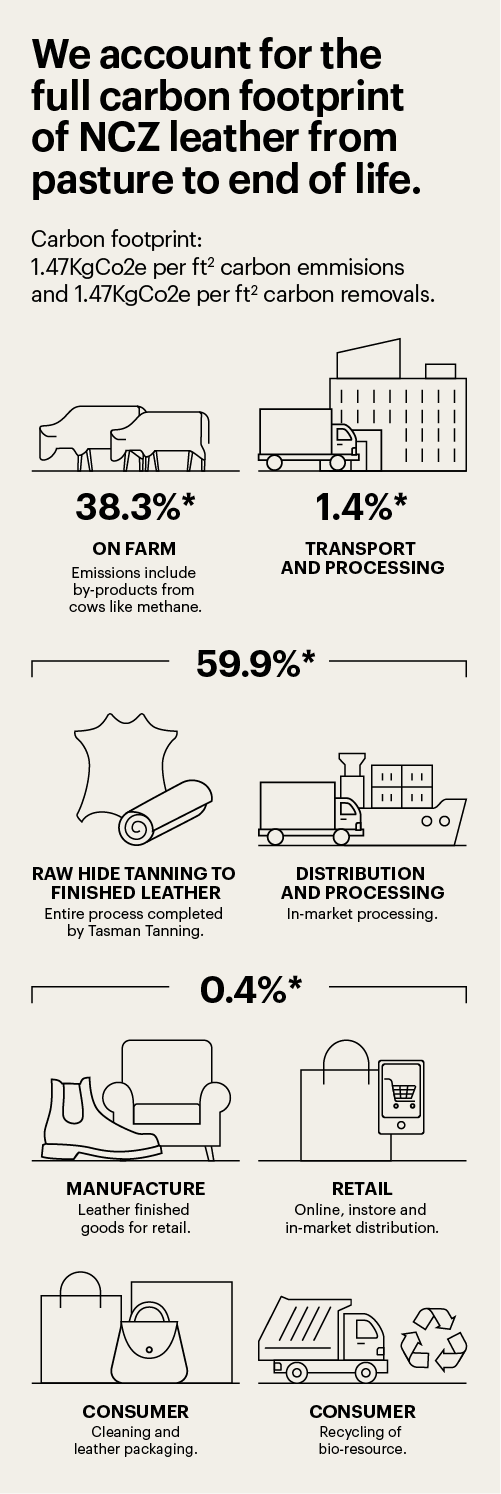 Our Net Carbon Zero finished leather is Toitū-certified to the ISO 14067:2018 product standard. Toitū Envirocare is New Zealand’s leading independent climate performance certifier and a government-owned Crown Research Institute. Certification is enabled through our partnership with AgResearch, which measures emissions across the entire lifecycle—from animal birth to finished leather.